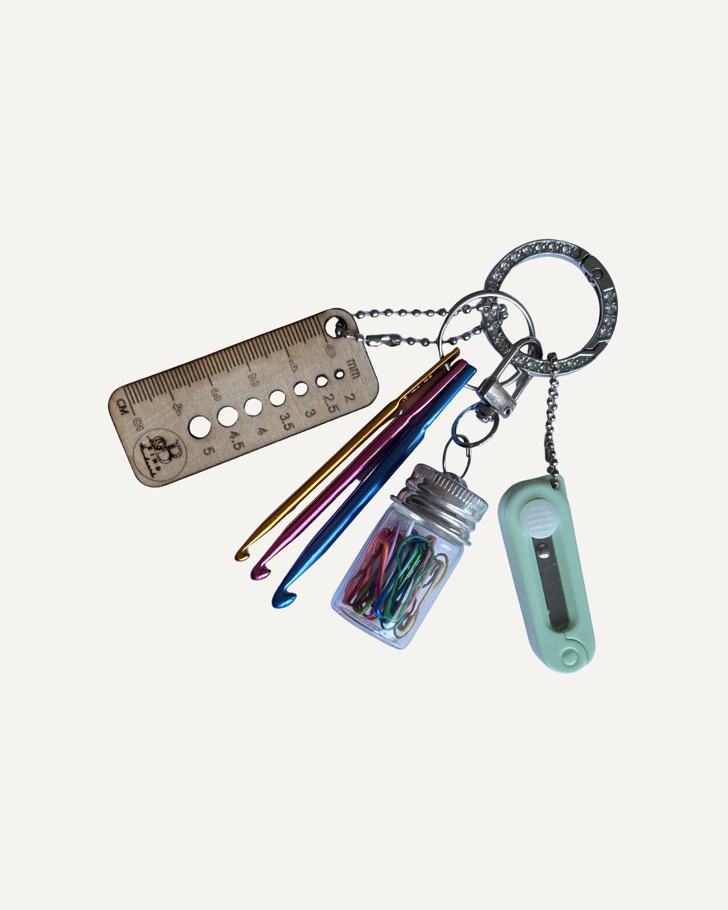 Handavinnukippan frá B Kind handverk inniheldur heklunálar, ferðaskæri, prjónamæli og glerkrukku með 20 opnanlegum prjónamerkjum. Fullkomið handavinnutól á ferð og flugi.